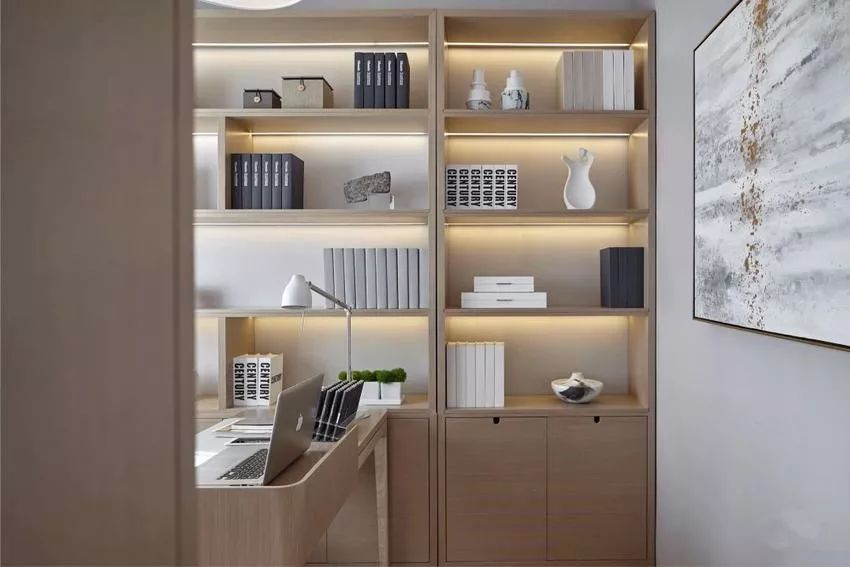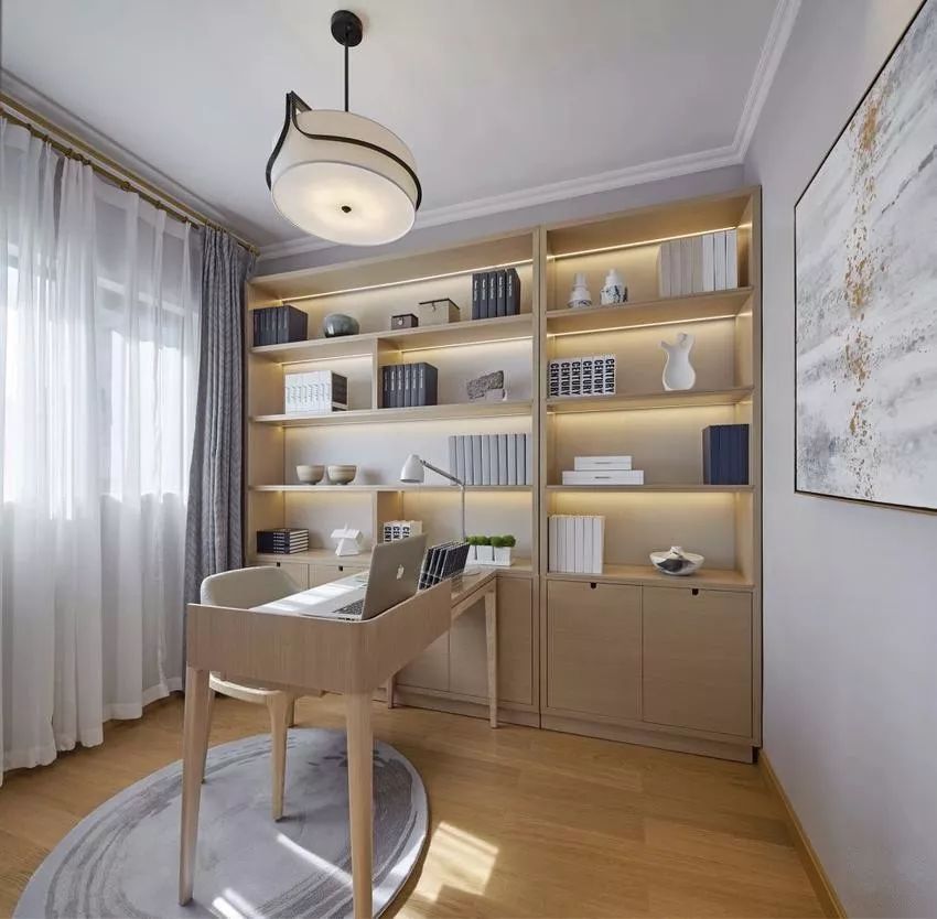 书房设计合理划分出书写、电脑操作、藏书区域,保证了书房的功能性,同时在注意营造书香与艺术氛围外,偌大的两面窗和大主灯也保持了书房良好的通风与采光。