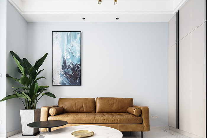沙发的右手边放置一盆绿植做点缀,茶几是考虑了岩板材质的,沙发墙选择了乳胶漆调制颜色,壁画做装饰,从简单中凸显出实用的功能。