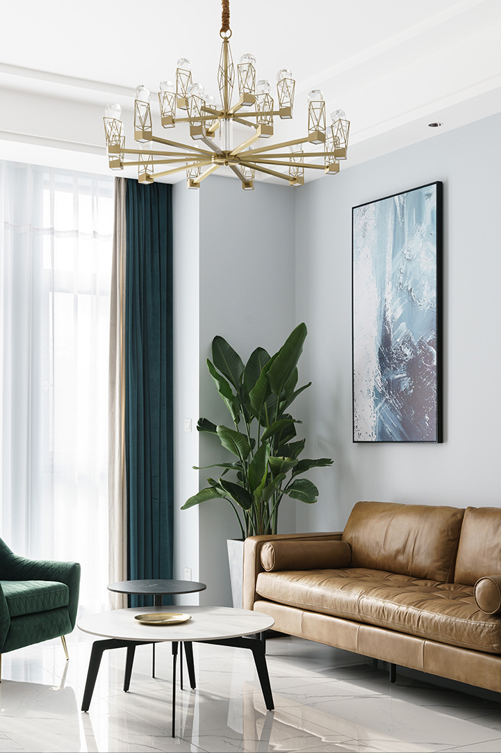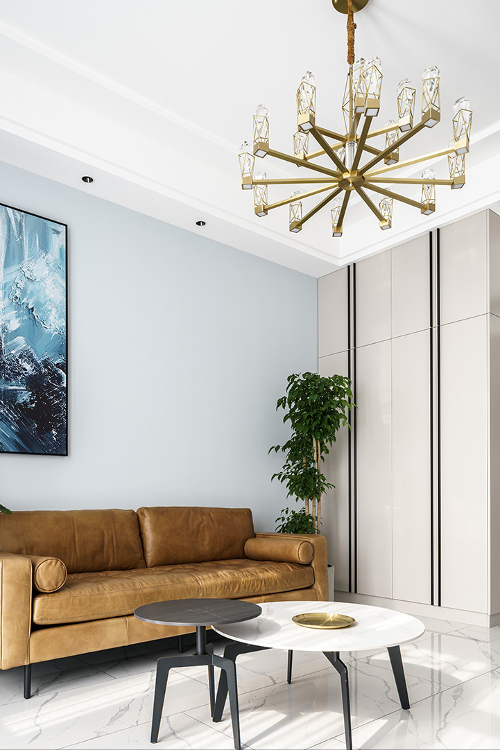 沙发考虑了双人位的布艺材质,颜色上完全临摹了金属轻奢的颜色,让客厅的空间变得更加奢华。
