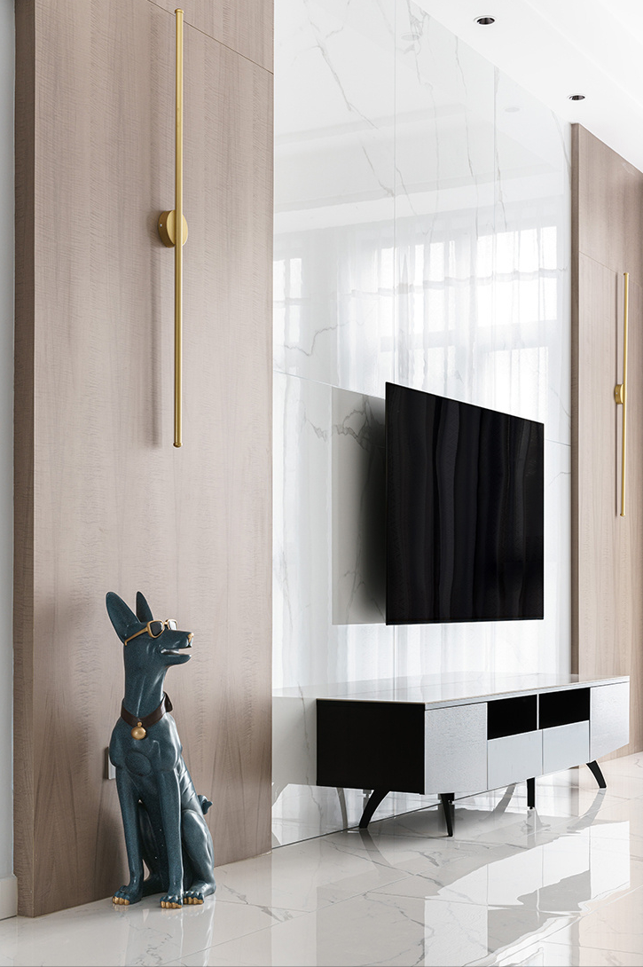 视背景墙设计师是按照近几年比较流行的轻奢风格来花心思设计的,以大理石和木饰面做装饰,木饰面上方考虑了黄铜材质做点缀,瞬间让轻奢感凸显出来。