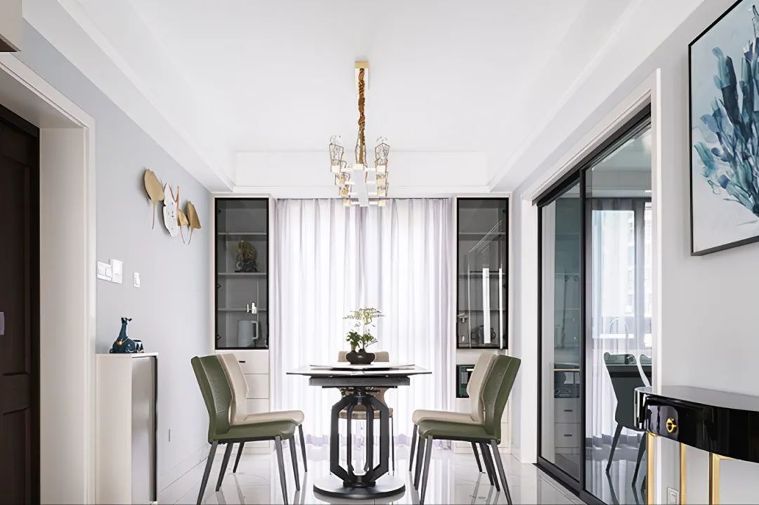 餐厅设计主要从家具以及软装方面上花了不少心思,餐厅墙面考虑了莫兰迪色系的乳胶漆,餐桌桌面材质是选择了岩板,黑色让餐厅空间瞬间变得更加稳重,抹茶绿色的餐椅和乳白色的餐椅相互结合起来,让餐厅空间瞬间变得更加丰富。