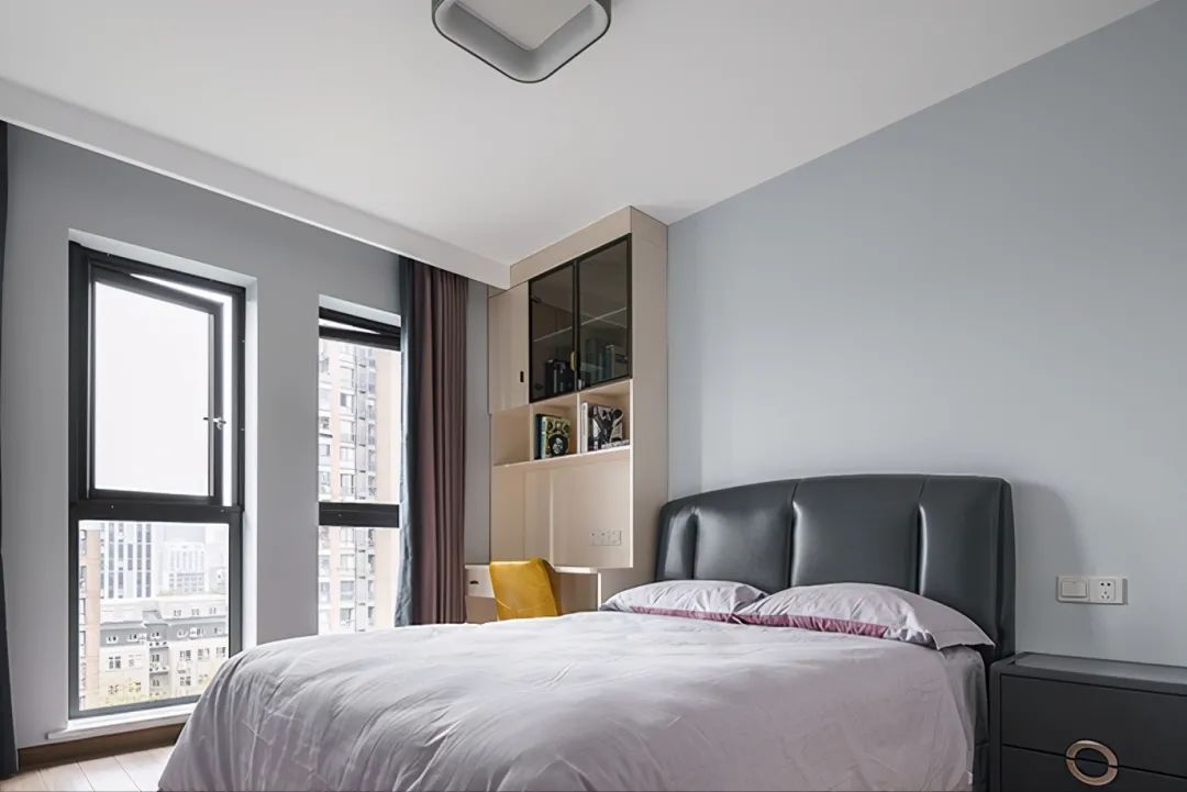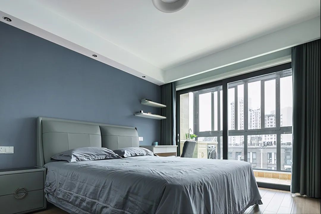 主卧室的床头背景墙是考虑了深蓝色的壁布,整体空间以冷色调为主,让主人瞬间冷静了下来。