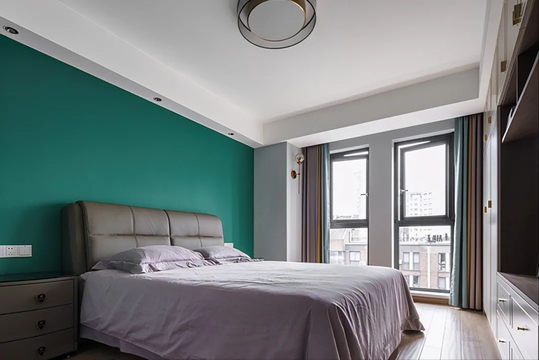 次卧室床头背景墙是涂刷了墨绿色的色漆,让整体空间瞬间充满活力。