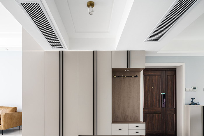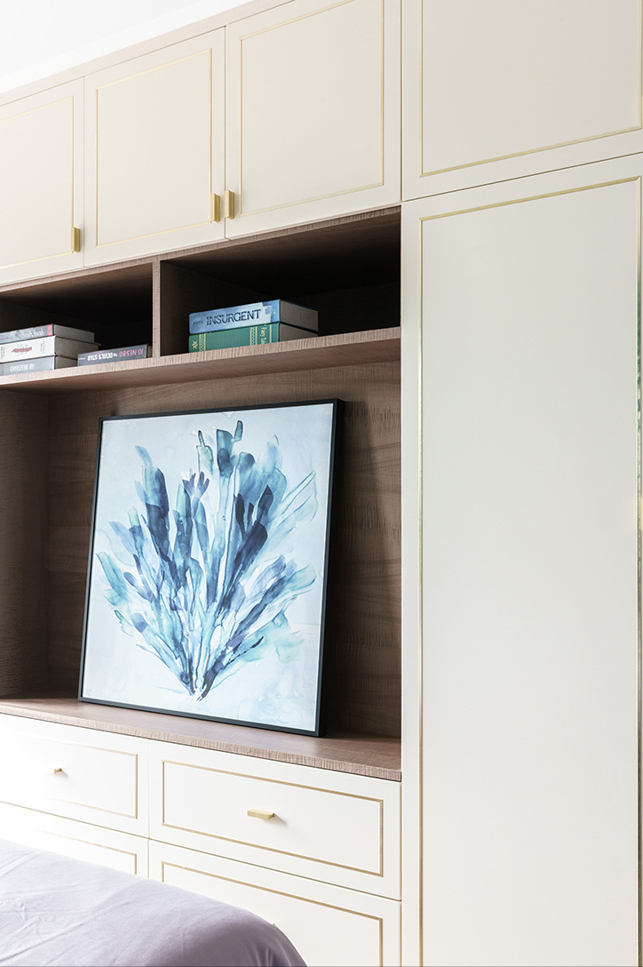 床后定制的一整排收纳柜,柜门是考虑了金属线条,柜门不是全白色,柜体是浅色系列的胡桃木色,木色+白色是屋主家比较喜欢的颜色。