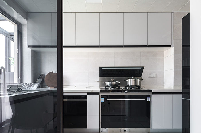 厨房橱柜是选择了白色,因为屋主也有一些洁癖,考虑白色的柜门同时让厨房空间每天都要保持一定的干净清爽程度,这样也时常提醒自己打扫卫生。