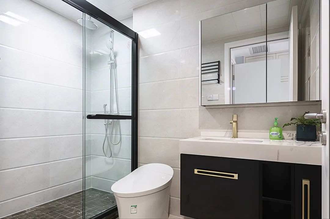 卫生间考虑了玻璃淋浴房做干湿分离,淋浴区地面选择拉槽的处理,浴室柜的柜门是选择了哑光黑把手是金属材质,瞬间让卫生间变得比较高级,简单的干湿分离也能满足家人日常生活的需求。