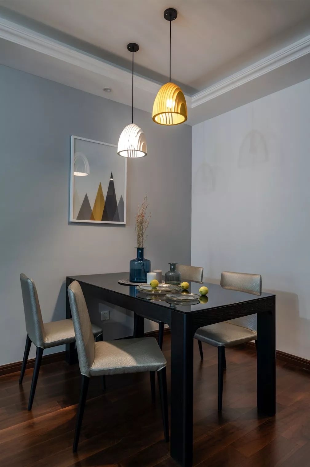 为了避免太过昏暗,餐厅的配色也是以浅灰色为主,搭配黑色的餐桌椅,显得格调满满,这两盏吊灯看起来也挺有趣的。