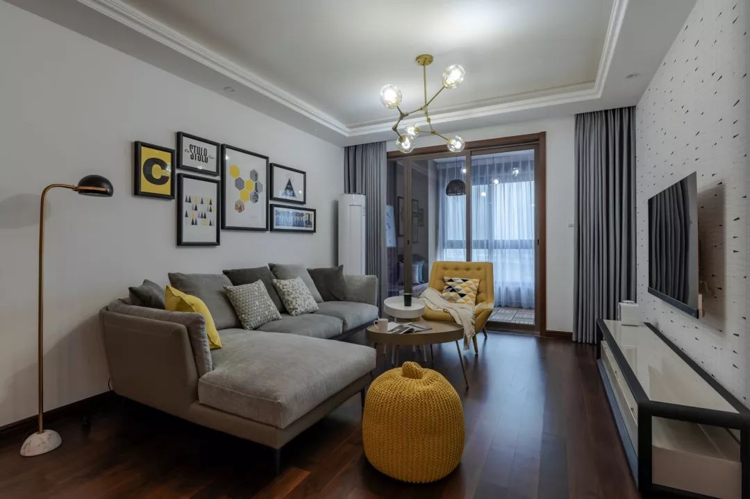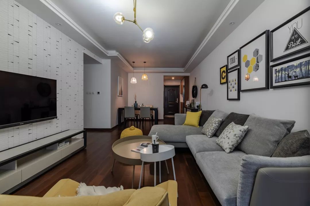 沙发背景墙延续了玄关、餐厅的配色,浅灰色的布艺沙发搭配几幅简单的装饰画,亮黄色的单椅和脚凳让客厅多出一些活力感。