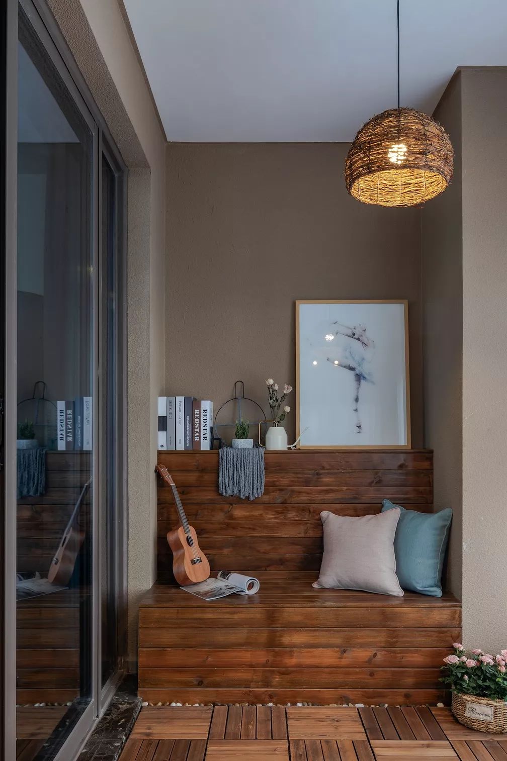 客厅外的阳台被改成了一个休闲区,其中一侧做上卡座,方便屋主在这里晒太阳、看书。整个阳台铺上防腐木,更为耐用也显得更有自然感。