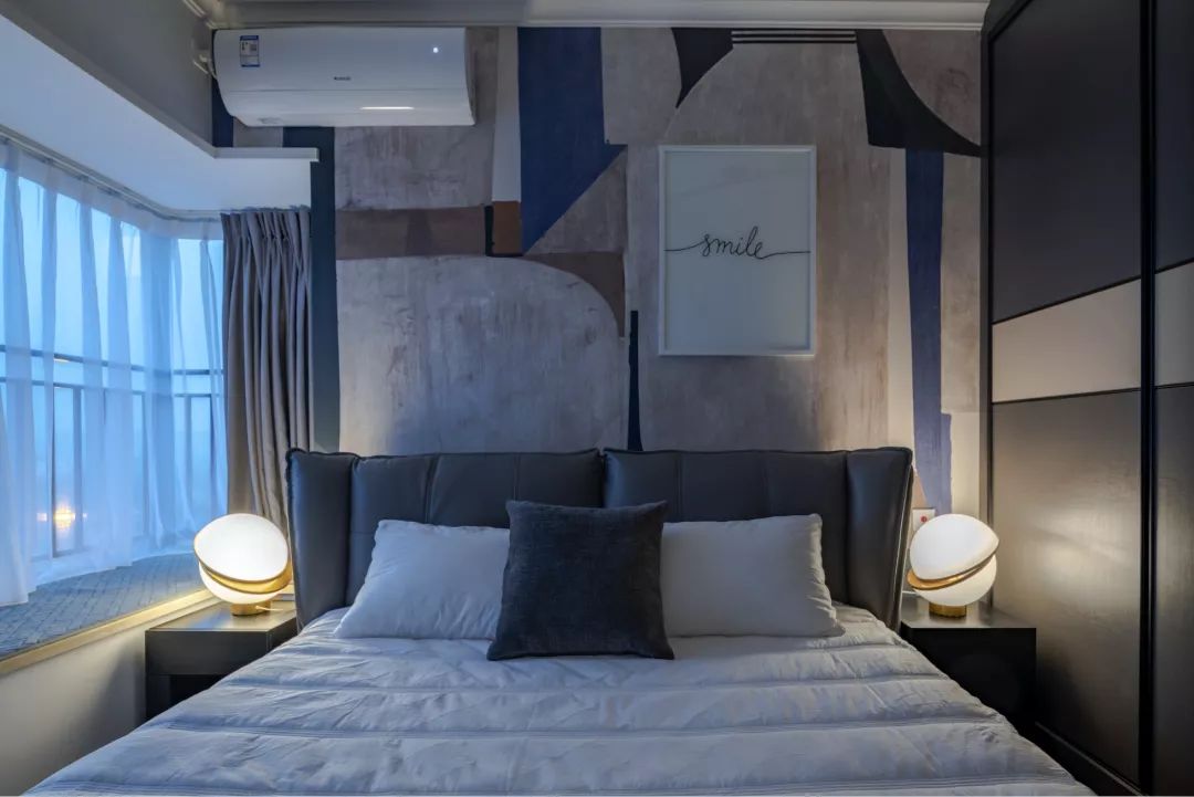 主卧室的面积并不算很大,一张双人床加上两个床头柜和衣柜就占满了整个卧室。床头背景墙铺贴了创意的壁纸,搭配皮质靠背显得更有现代感。
