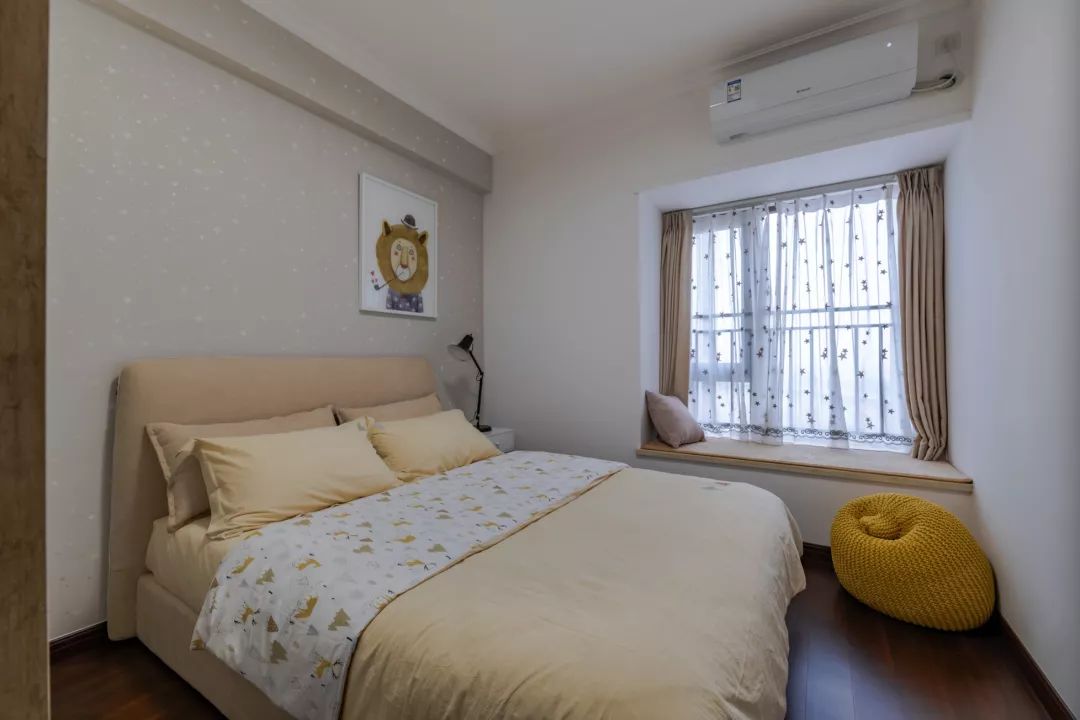 儿童房的搭配会更为简单一些,床头背景墙的壁纸选择了暗纹印花的款式,米色的床和黄色的床品结合,让儿童房多出一些温馨感。