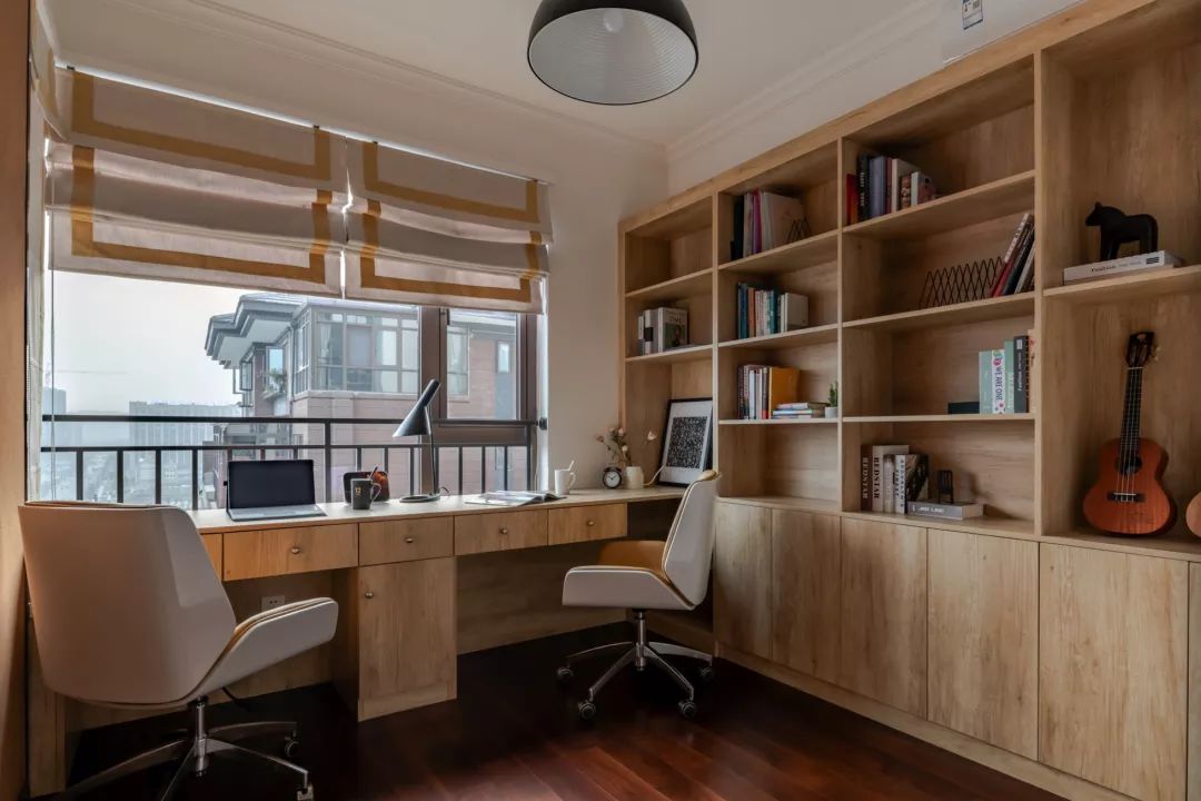 还有一间卧室被设计师改成了书房,靠着窗户做个双人位的书桌,这样夫妻俩可以一起工作和学xi,侧方的木质书柜满足了书房的收纳需求。