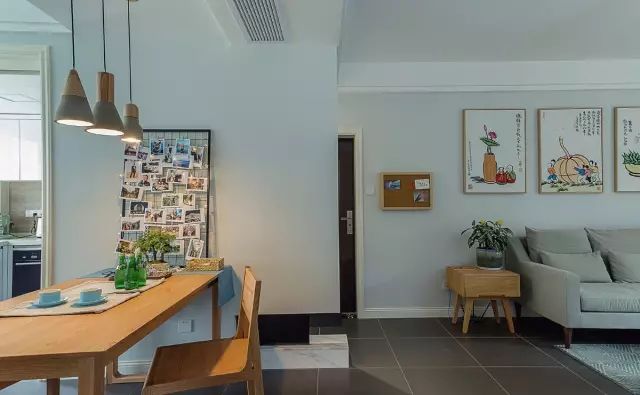 入户门和餐厅之间做上了一个隔断,避免了入户门直对卫生间门的风水问题。餐桌椅边上做个照片墙,让餐厅多出一些温馨感。