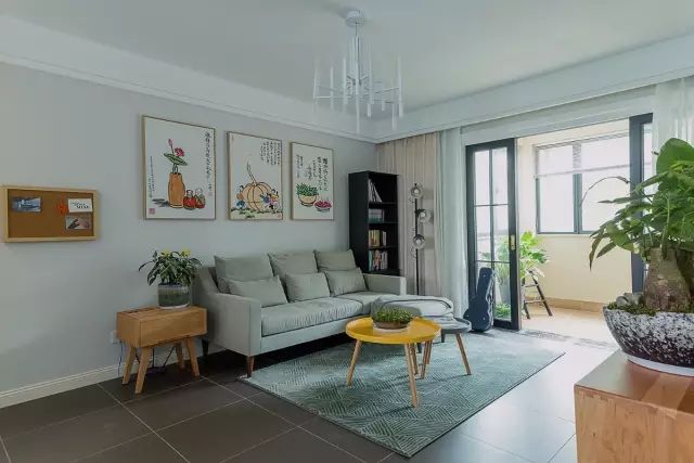 玄关的侧方是客厅空间,沙发背景墙刷成了浅色调,搭配三幅可爱的挂画作为点缀。客厅摆放了多种绿植,让人感觉更为清新。