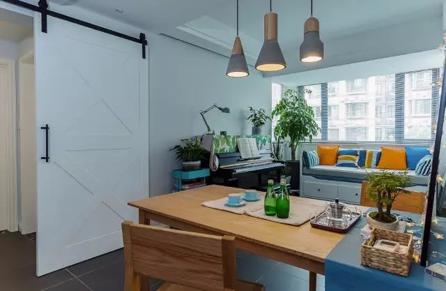 餐厅和卧室走廊之间加装了一扇谷仓门,原木风的餐桌椅搭配简洁吊灯,显得轻松自在。餐厅的边上还有一个休闲区,做了一个卡座。