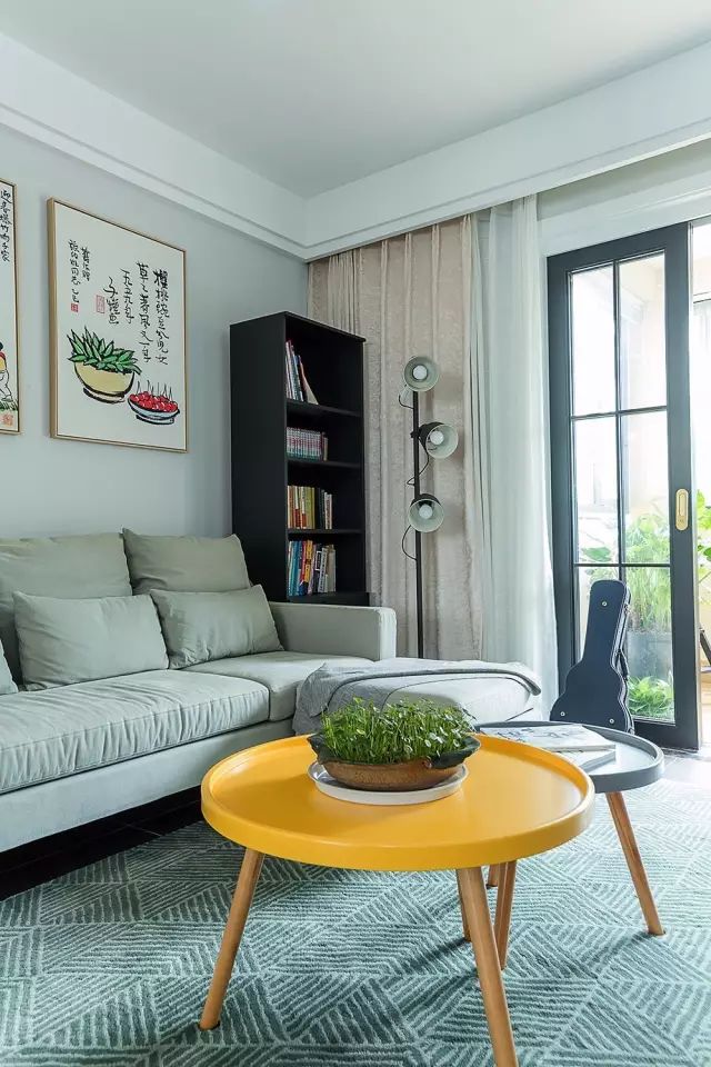客厅的角落做了一个立式的书架、搭配落地灯和椅子,打造一个舒适的阅读角。大小、高低不一的茶几,带来了一些北欧风的感觉。