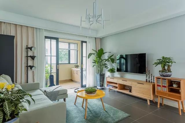 客厅的电视背景墙和沙发背景墙刷成了相同的颜色,墙面不做装饰,保持简约感。客厅外的阳台改成了洗衣房,用玻璃门隔开可以遮挡晾晒的衣服。