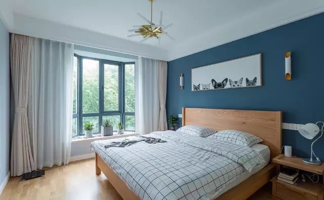 主卧室的床头背景墙刷成了深蓝色,加上一个可爱的动物装饰画,两侧的壁灯款式也非常好看。还有一个弧形飘窗,更加惬意悠闲。