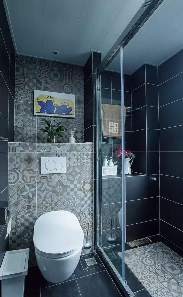 卫生间内部做了干湿分离的设计,淋浴房内的地方和马桶后方铺贴了花砖,给卫生间带来了更多的装饰感,整体黑色的氛围显得更为时尚。