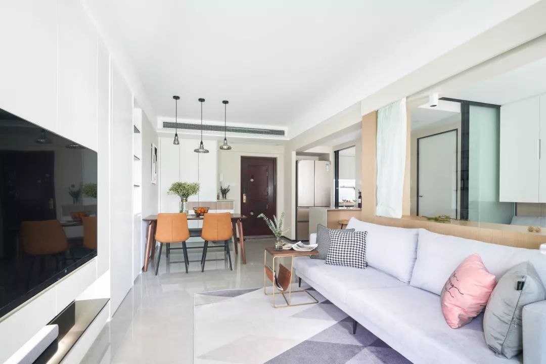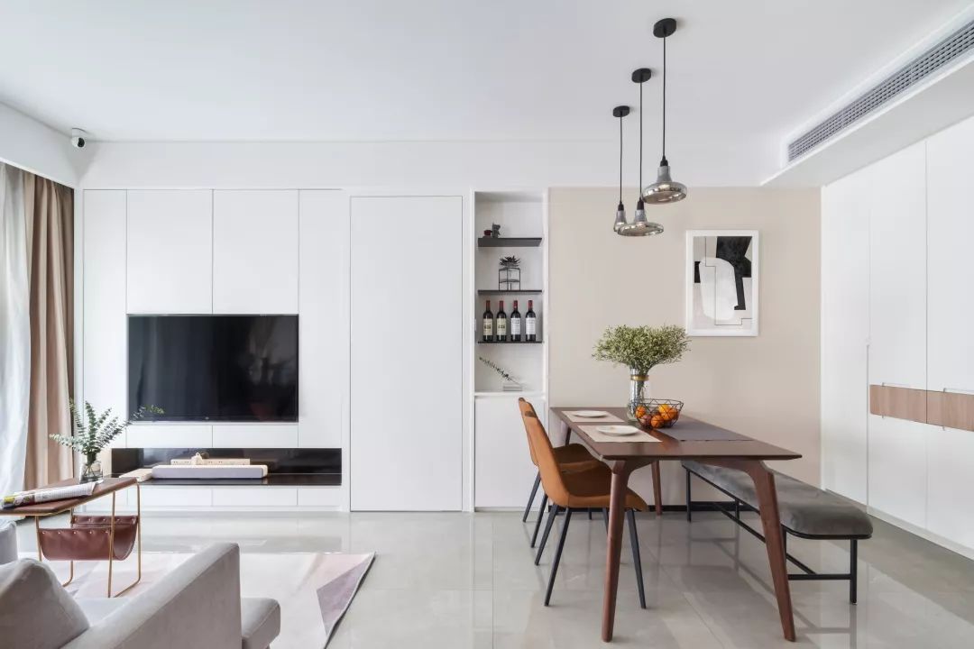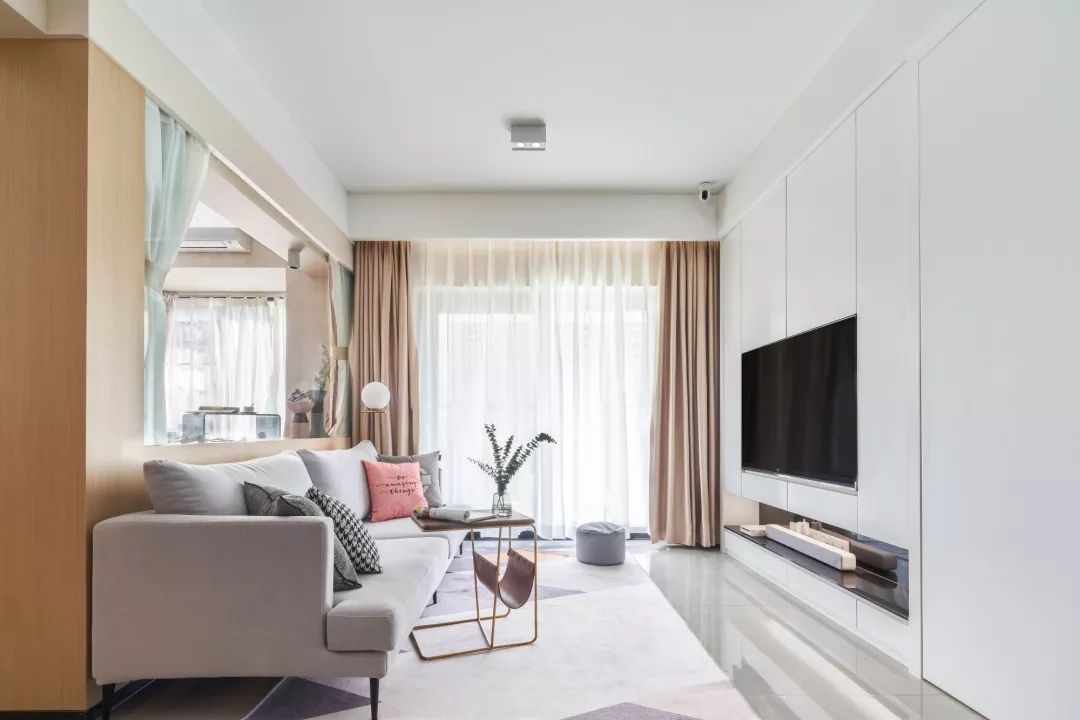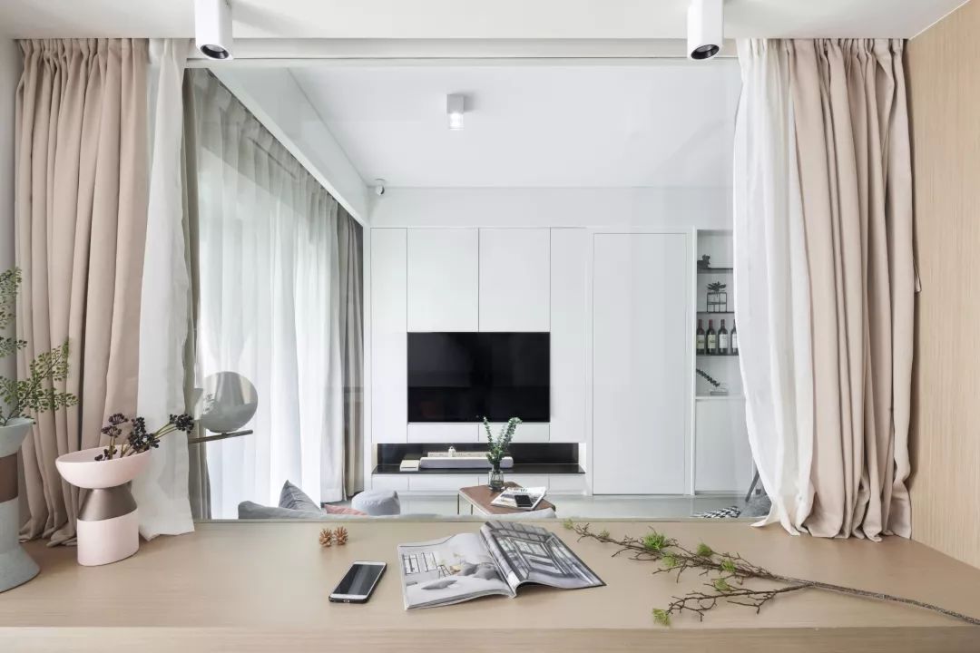 ▲ 客厅以白色为基调,入嵌式的电视柜更加节省空间,也更加实用,白色的门框,也让视野更加开阔。