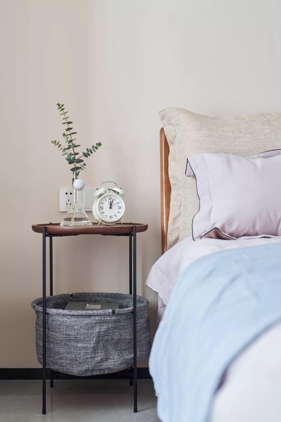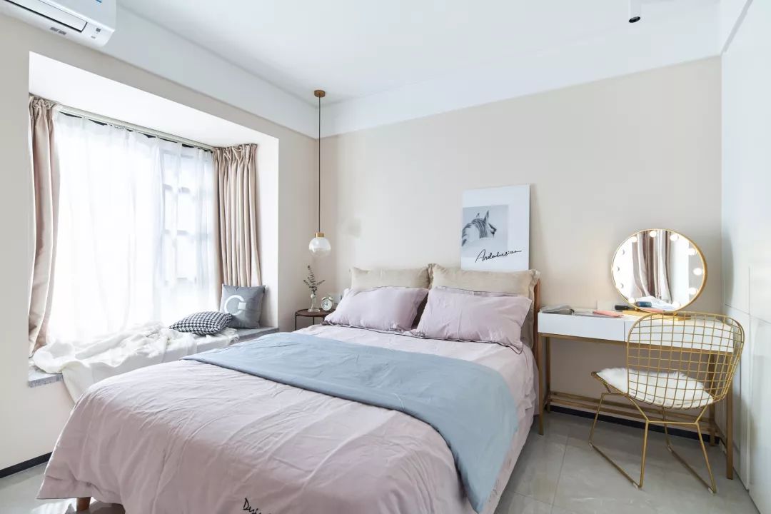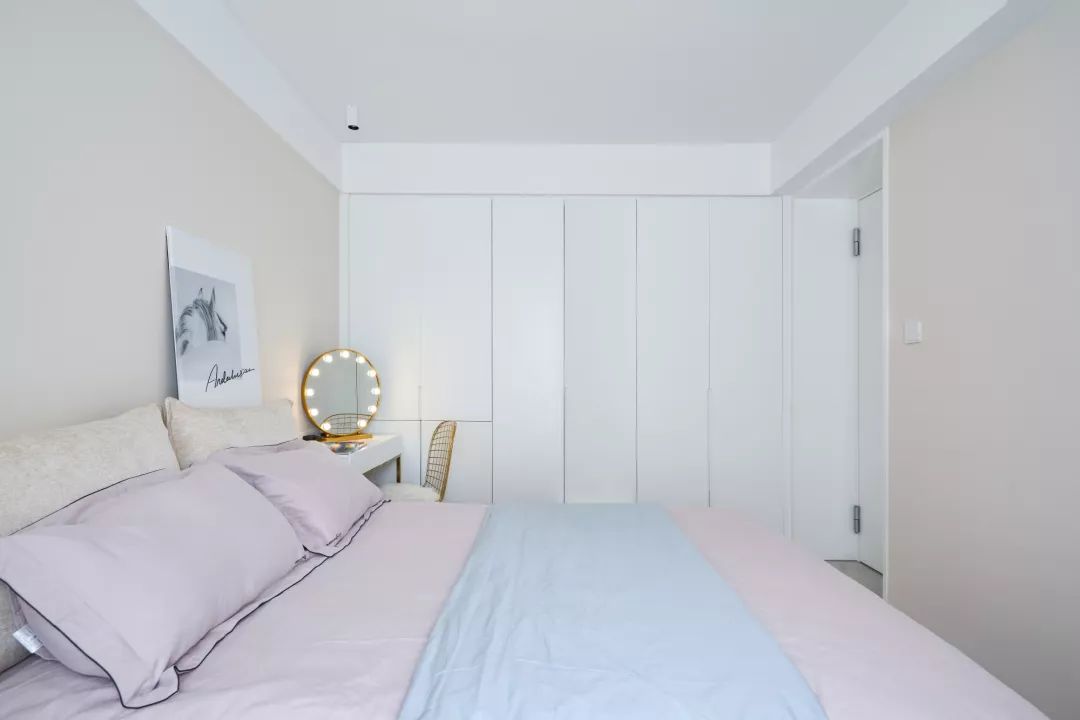 ▲ 主卧配色柔和优雅,藕粉色与物蓝色的搭配,更加清亮。