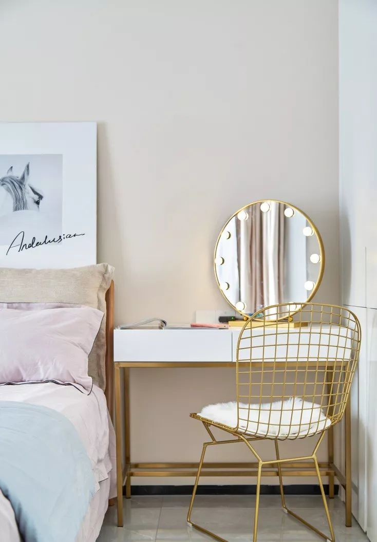 ▲ 梳妆台放在床头和衣柜之间,用了黄铜色的材质,更显精致。
