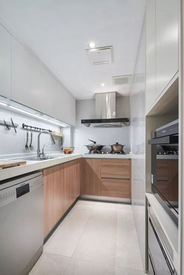 ▲ 厨房灰色与原木的搭配也是出乎意料的和谐,一字型的厨房,方便操作,简洁明了。