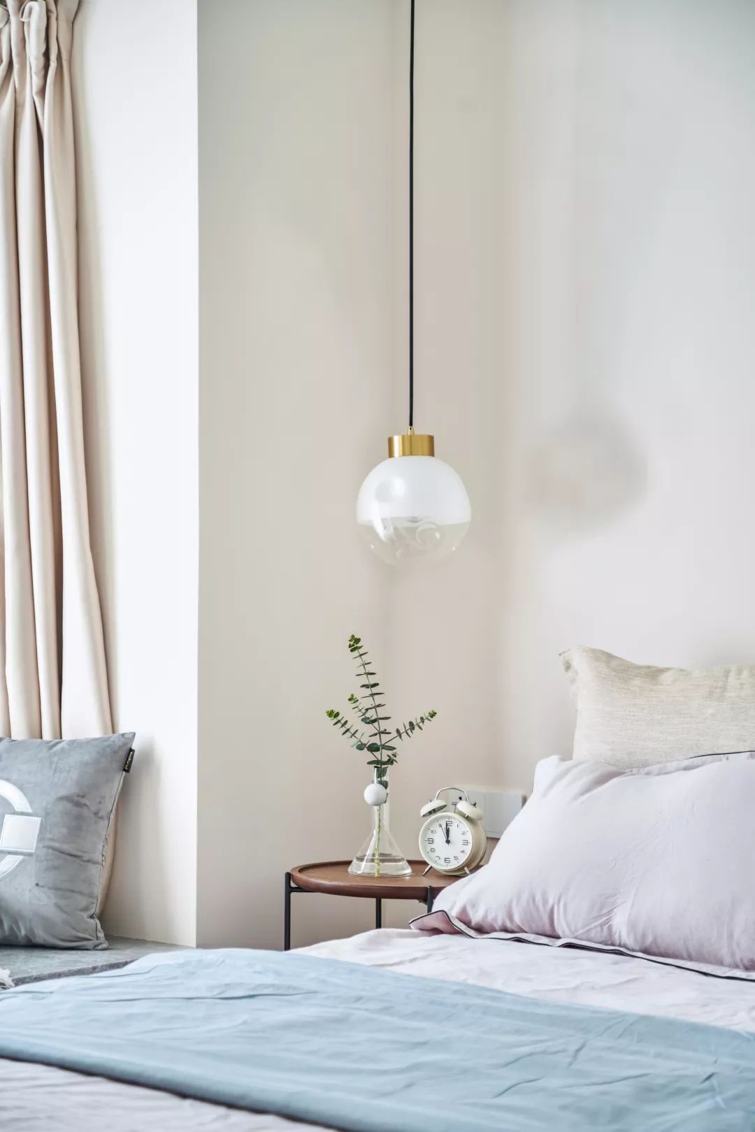 ▲ 另一边则是简易的小边几,圆形的小吊灯,更显别致。