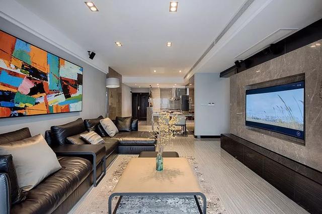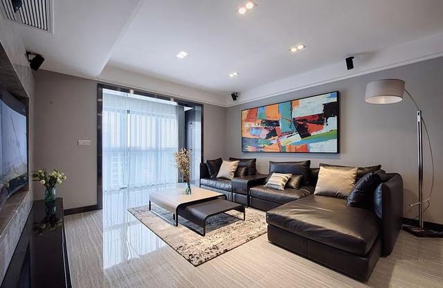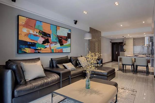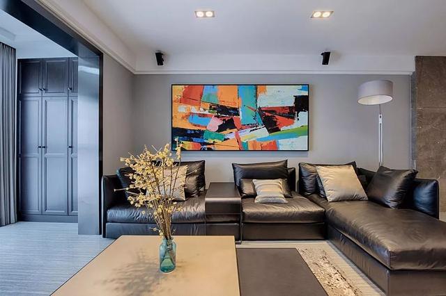 ▲ 客厅,墙壁采用了灰色系,搭配黑色真皮沙发,低调沉稳有魅力。