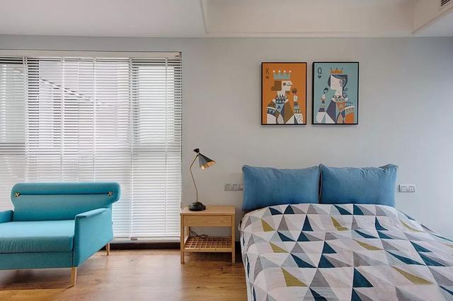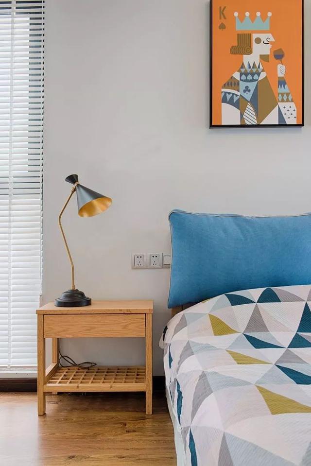 ▲ 床头背景墙的装饰画同样不简单,蓝橙两色由深入浅渐变,撞色撞出了不一样的视觉效果。