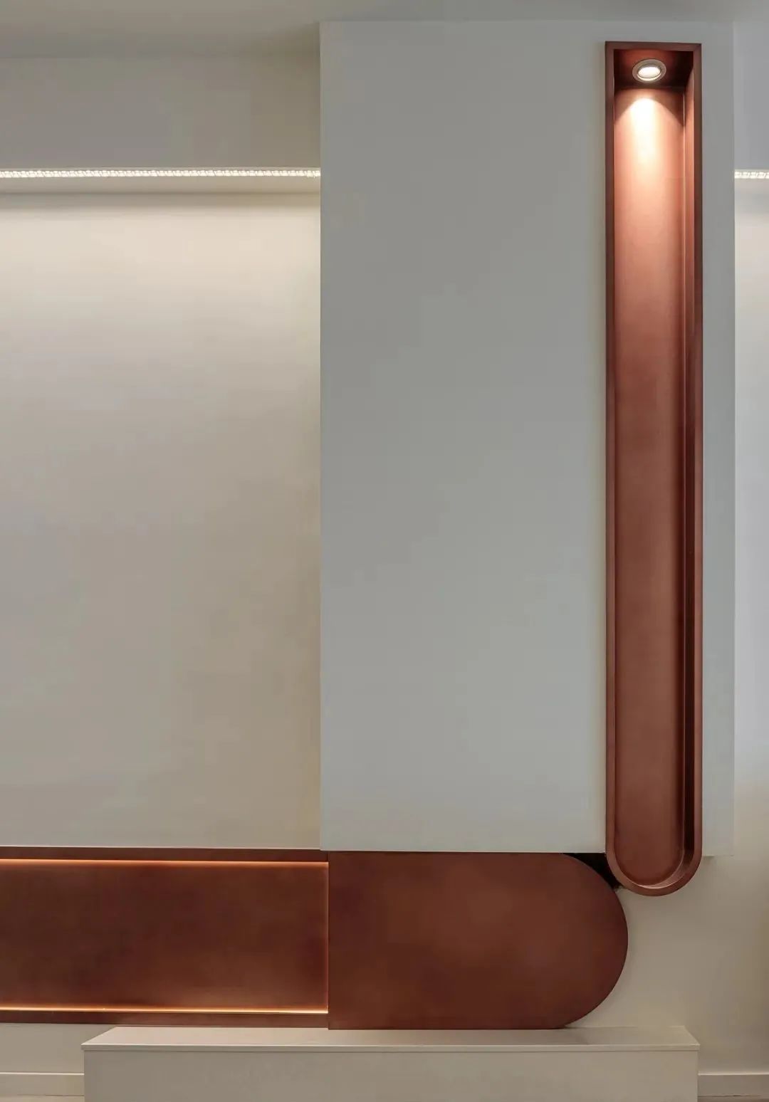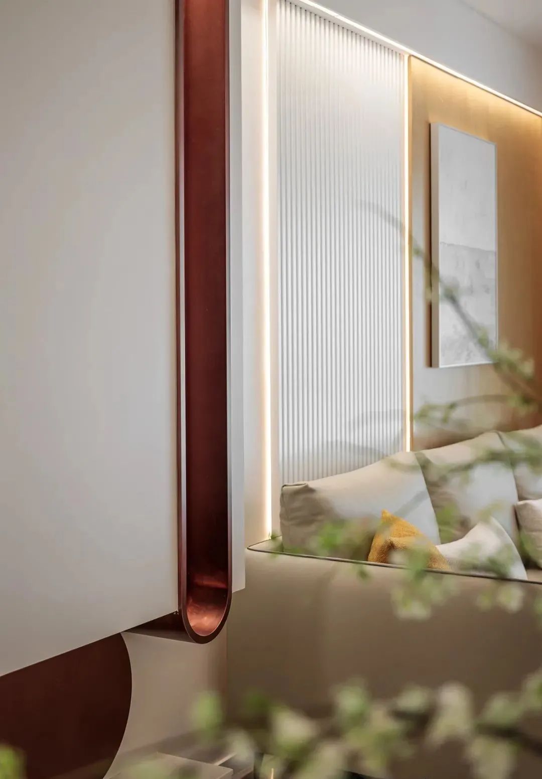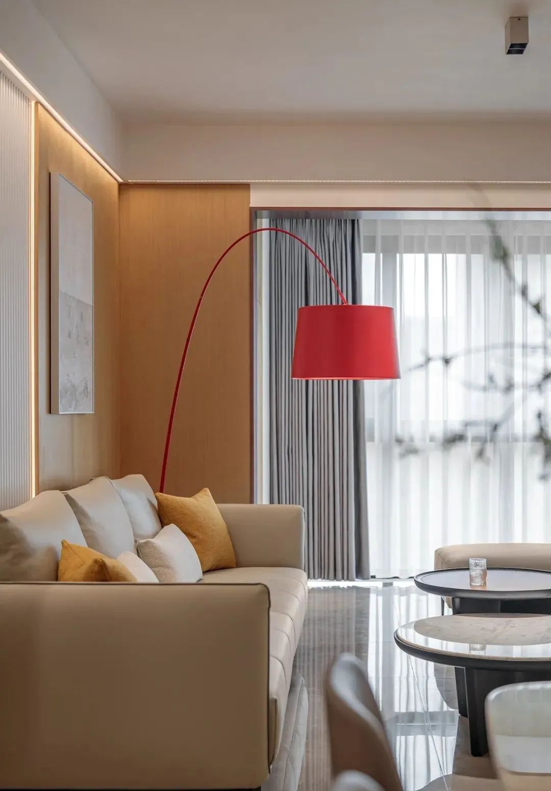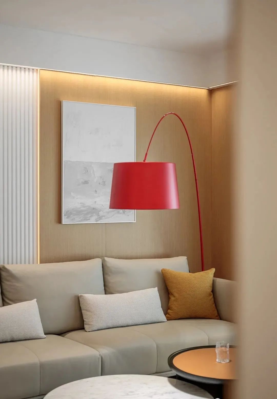 而古铜色的拱形造型,鲜艳欲滴的落地灯,色彩跳动的搭配,让整个客厅在平和的观感下暗藏一丝妖娆。