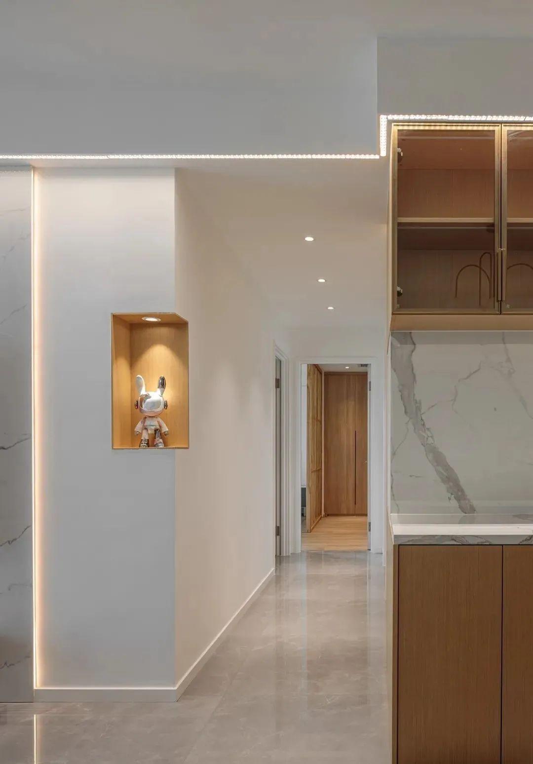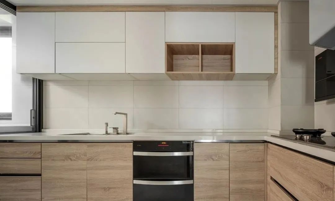 厨房是L型布局,地柜运用原木色,吊柜采用白色穿插木色,自然简洁且有层次,白色台面、背景和吊柜,在视觉上不会产生方式压抑局促感。
