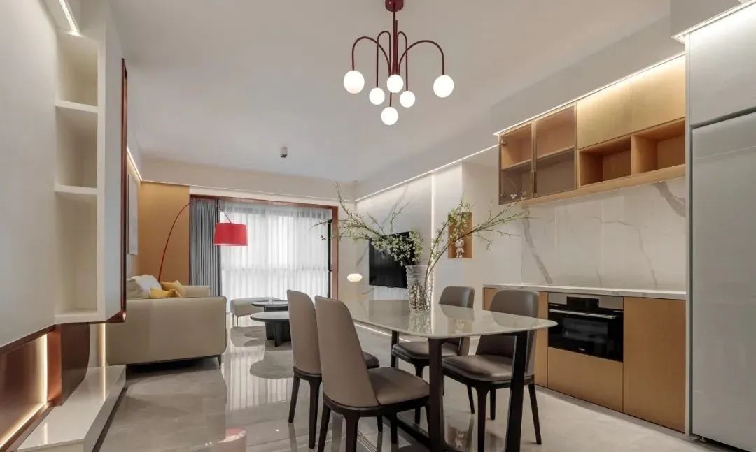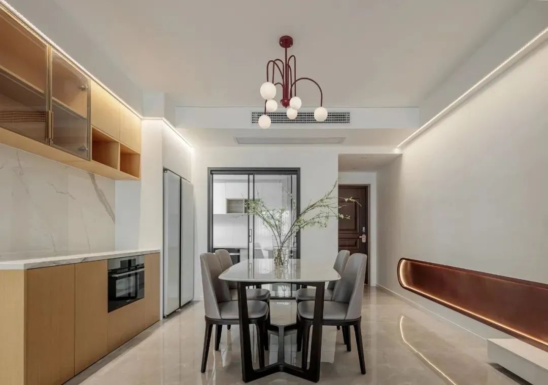 客餐厅以过道为界,整体开阔通透。餐桌居中摆放,两侧都留出了足够舒服的通行距离,两侧的定制柜充分满足了收纳所需。