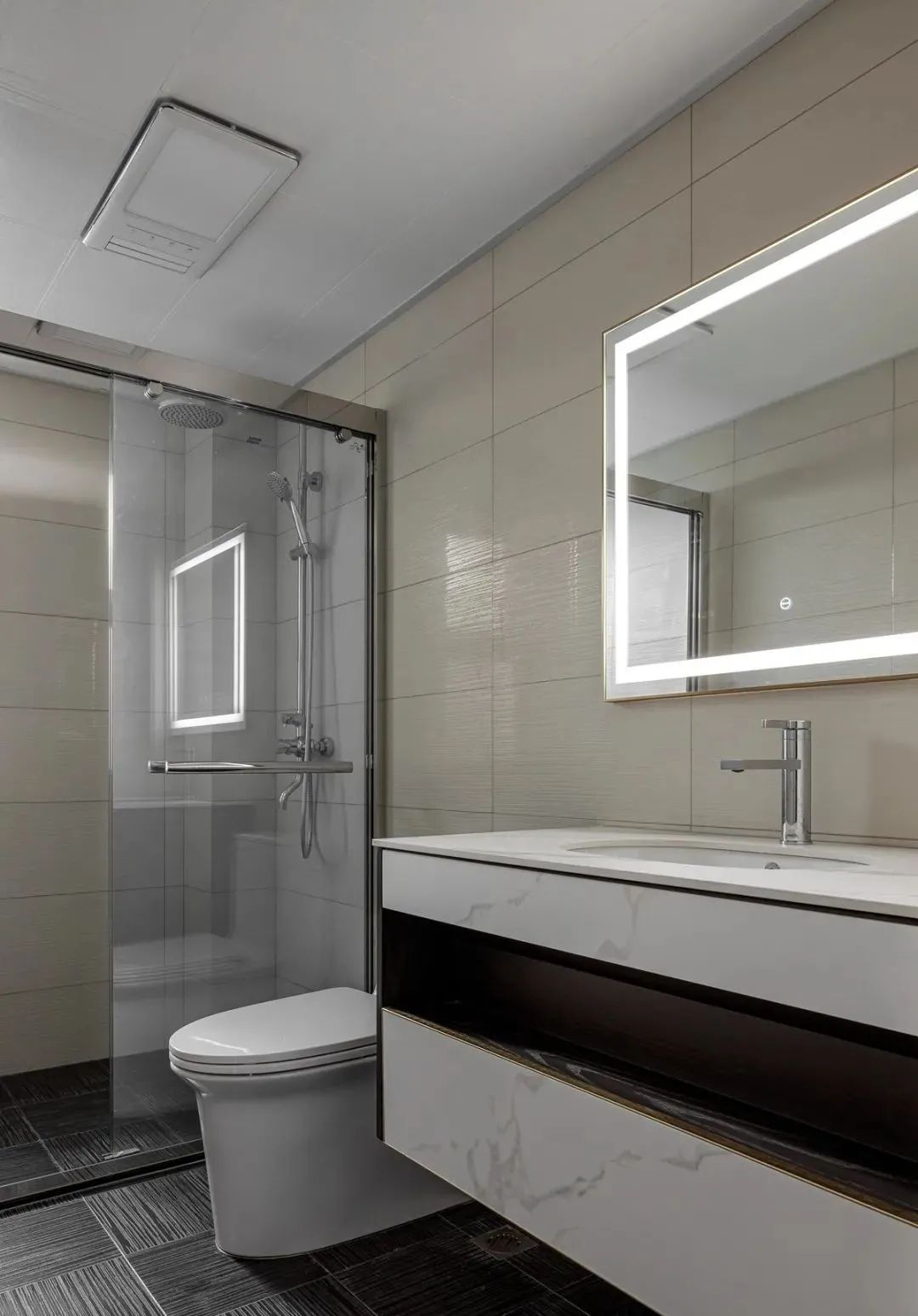 卫生间干湿分离,地砖墙砖还有卫浴柜的选择以好打理为标准。