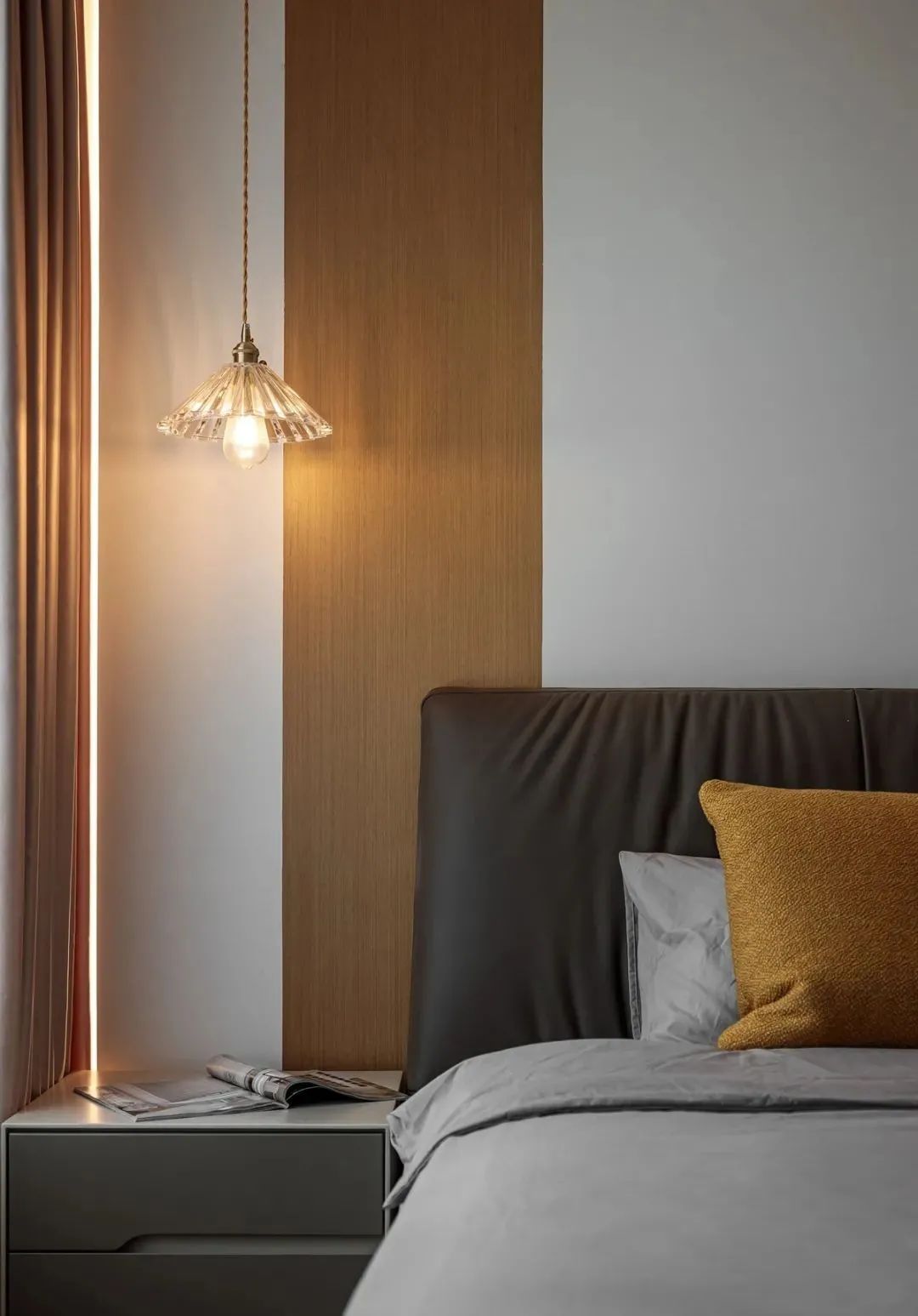 床头的水晶吊灯还有背景的线性灯带及顶部的筒灯构成了主卧柔和而有氛围的照明。