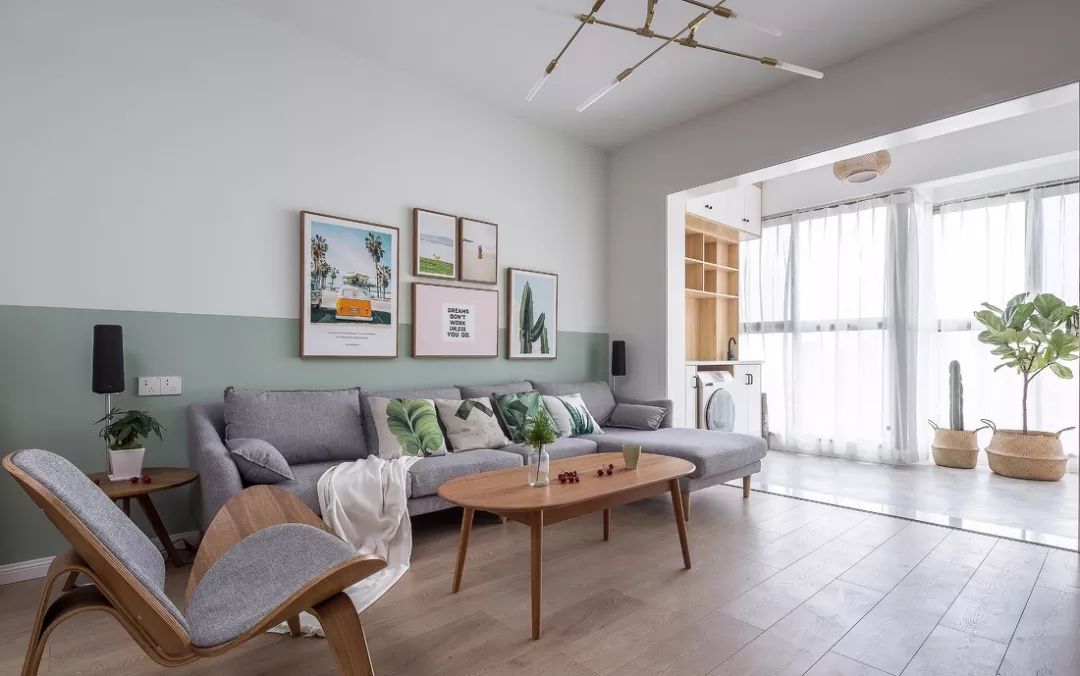 ▲ 木质地板,灰色布艺沙发,浅草绿墙群,颜色中和的刚刚好,落地窗和白色纱帘,将屋子的通透度提升了一个档次。