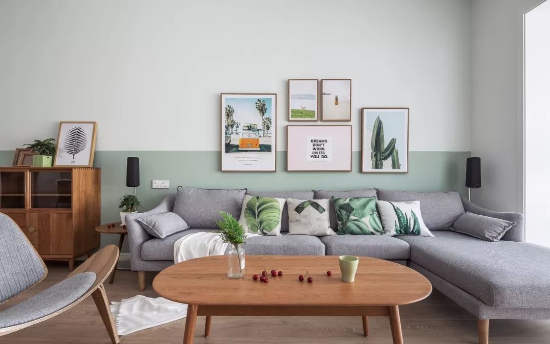 ▲ 简单的挂画,配合抱枕以及沙发的颜色,遥相呼应的同时,增添了自然清新的感觉。