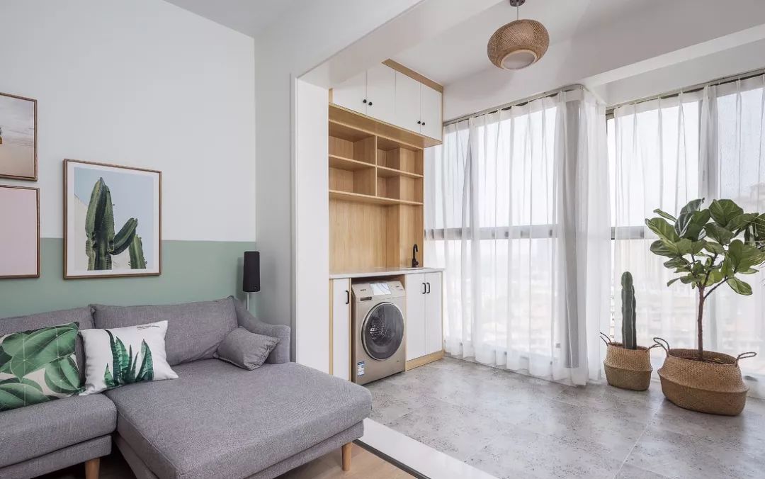 ▲ 阳台入嵌式的洗衣机以及收纳柜,收纳能力最大化的同时,也节省空间。微风吹拂,白色纱帘飘舞,夜色朦胧,怎一个美字形容。