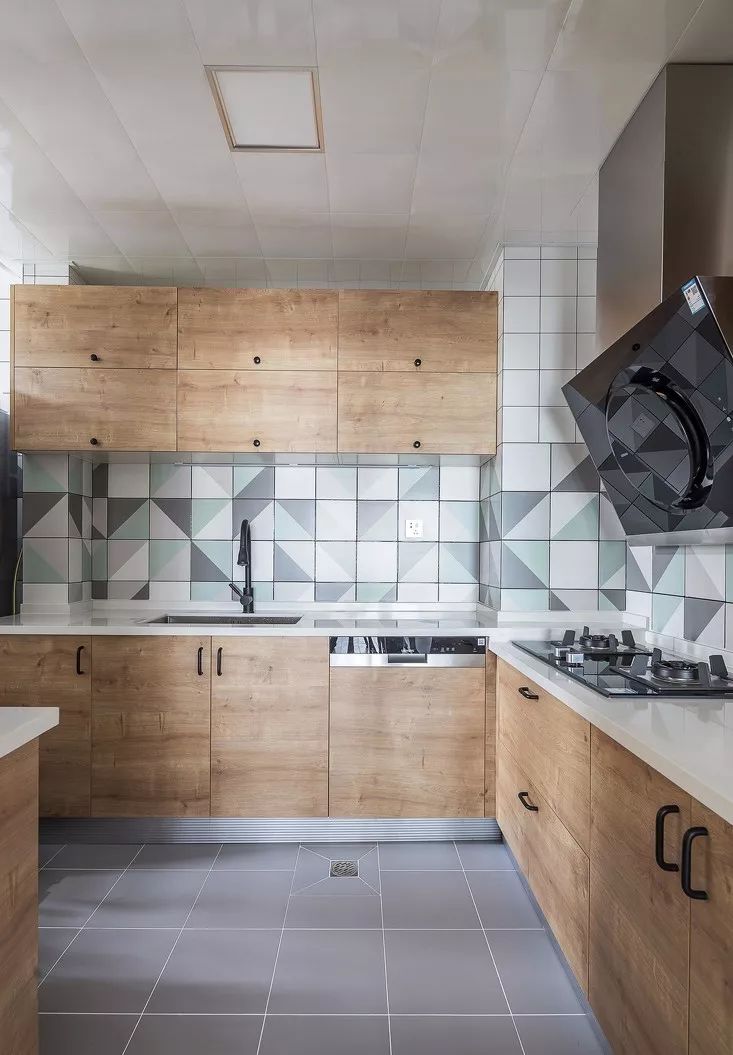 ▲ 厨房,原木色的橱柜配上白色的台面,干净简约,墙面花砖为厨房增加了一抹清新的感觉。