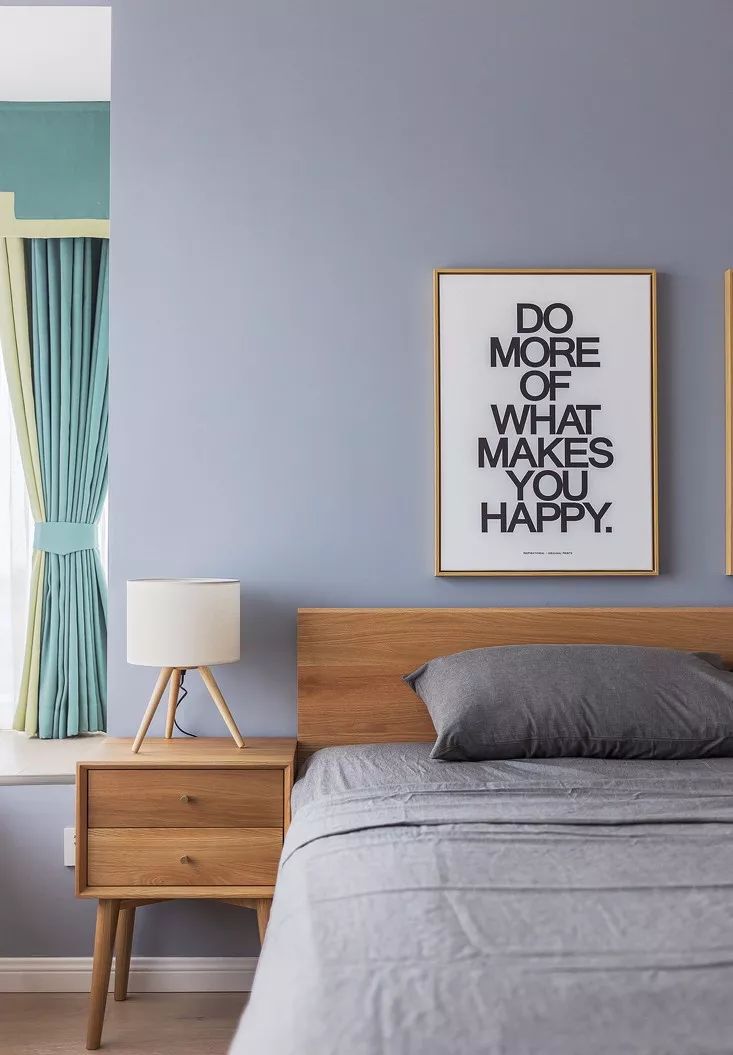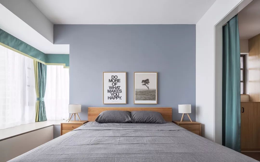 ▲ 黑白灰的主卧,静谧简约,绿色窗帘带来了清新感。