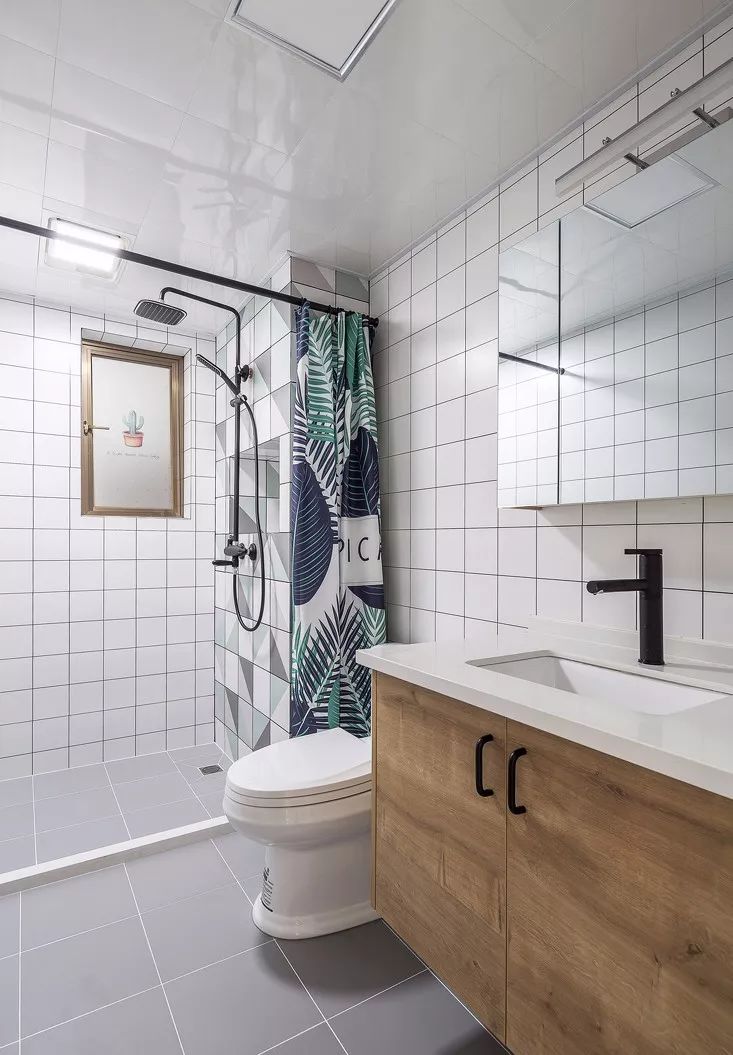 ▲ 用浴帘和挡水石来做干湿分离,保持干燥,墙砖和地砖风格与厨房一致,不同的是,卫生间的镜柜使用黑色把手,更加时尚。