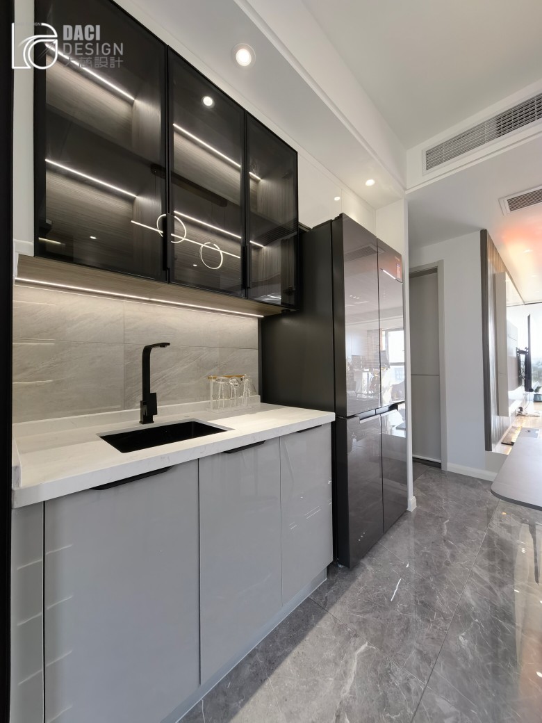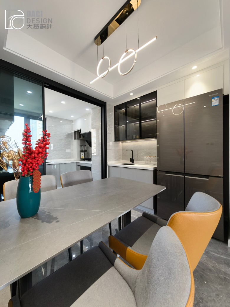 餐厅区域,在餐厅也设计了洗手台,上面吊柜,可以放些餐具,着实是很方便。