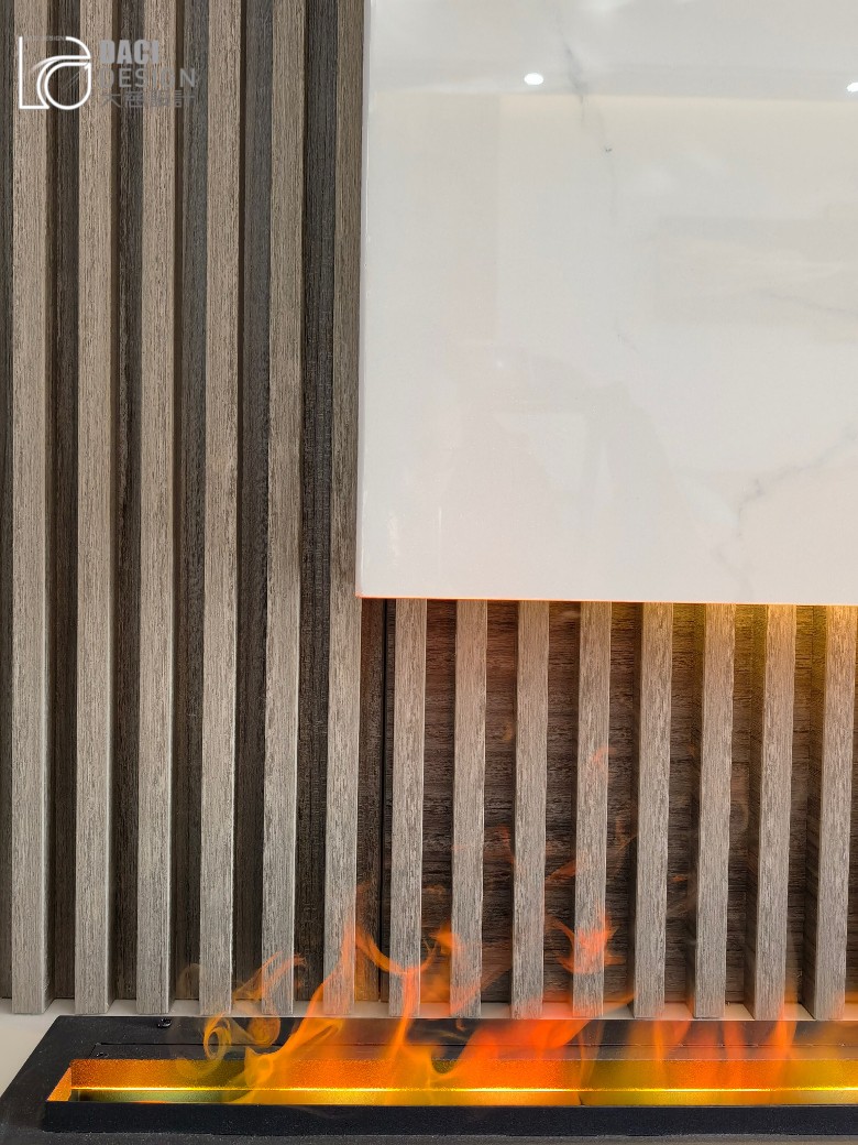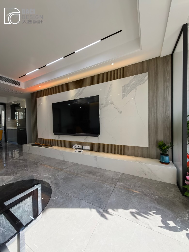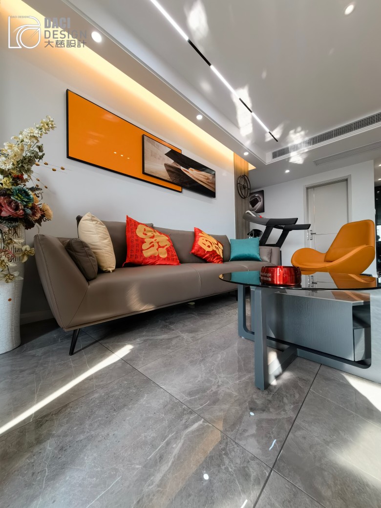 客厅的地面用了灰色瓷砖,墙面则是乳白色的,电视背景墙用了大理石与木质格栅,橘色沙发更显得突出亮眼使整个空间显得高级不失温暖。
