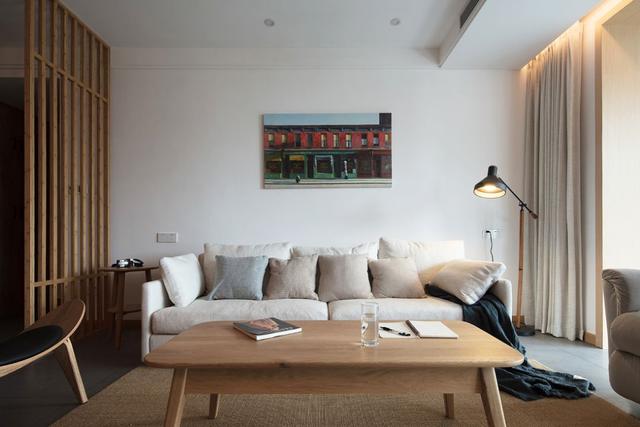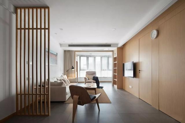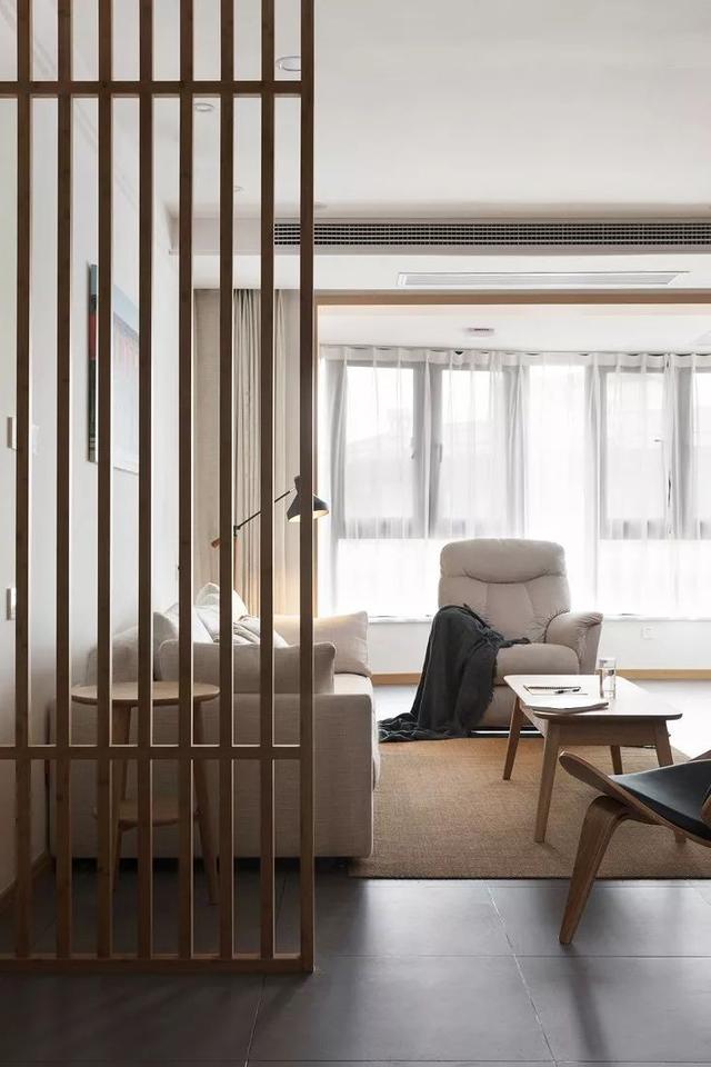 ▲ 框架结构的木质屏风,不仅将客厅和大门分隔,也让空间更有质感,更加有品味。