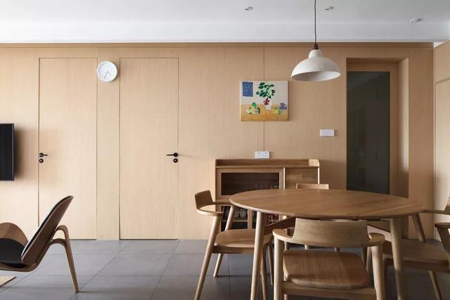 ▲ 餐厅的墙面延续了客厅电视背景墙的墙面,温润细腻。原木色与白色的墙壁在门口利用山水画门帘过度,显得自然清新。