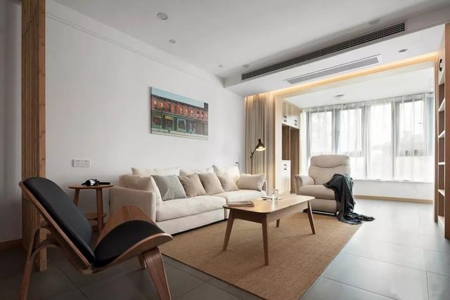 ▲ 深色的懒人椅与米色的沙发和原木色的茶几,很好的融合在一起,打破沉闷感,与灰色的地砖携手合作,让空间有了温润感。