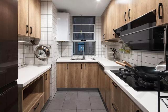 ▲ 灰色的地砖,黑色的厨具,原木色的橱柜。剩余的墙面和台面都由大面积的白色铺设,扩大空间感,又显得有品味。