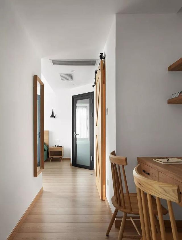 ▲ 衣帽间利用谷仓门,美观又节省空间,衣帽间对面挂了穿衣镜,方便整理仪容。