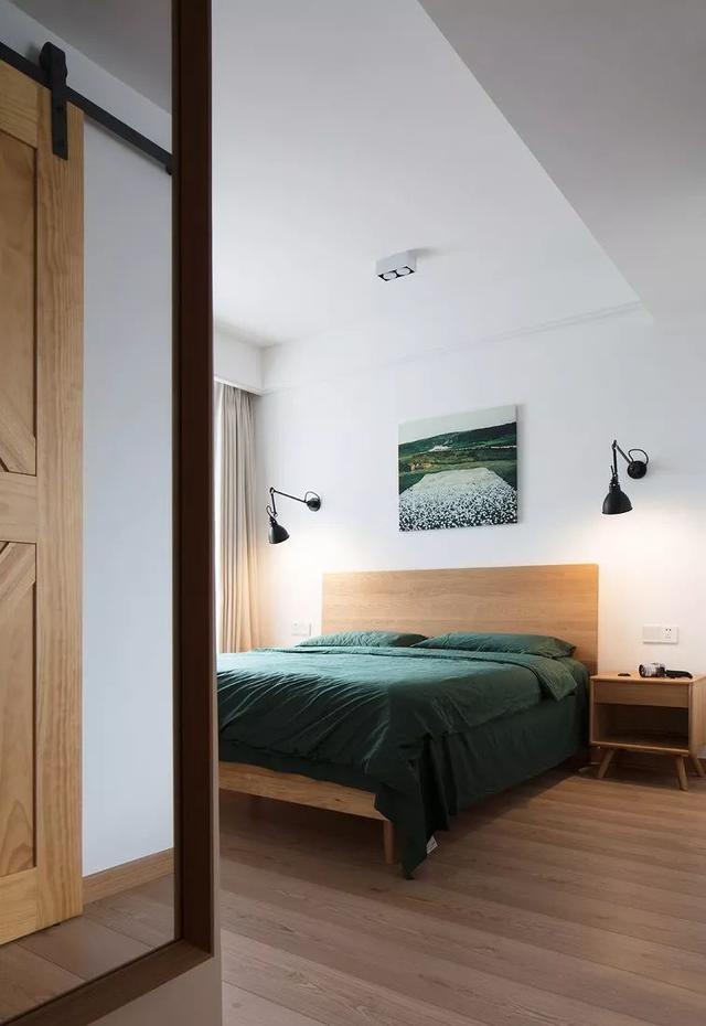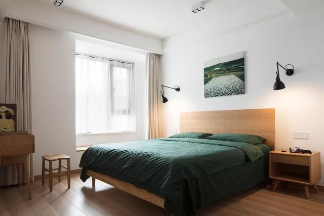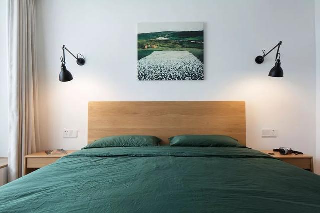 ▲ 墨绿色的床品与米色的窗帘,一深一浅,一柔一刚,原木色作为中和色调,使空间质感立马上升。