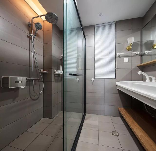 ▲整体利用灰色的墙砖,白色的洗手台下方,用搁板打造出的置物架,方便物品收纳,玻璃推拉门做出干湿分离,简洁。